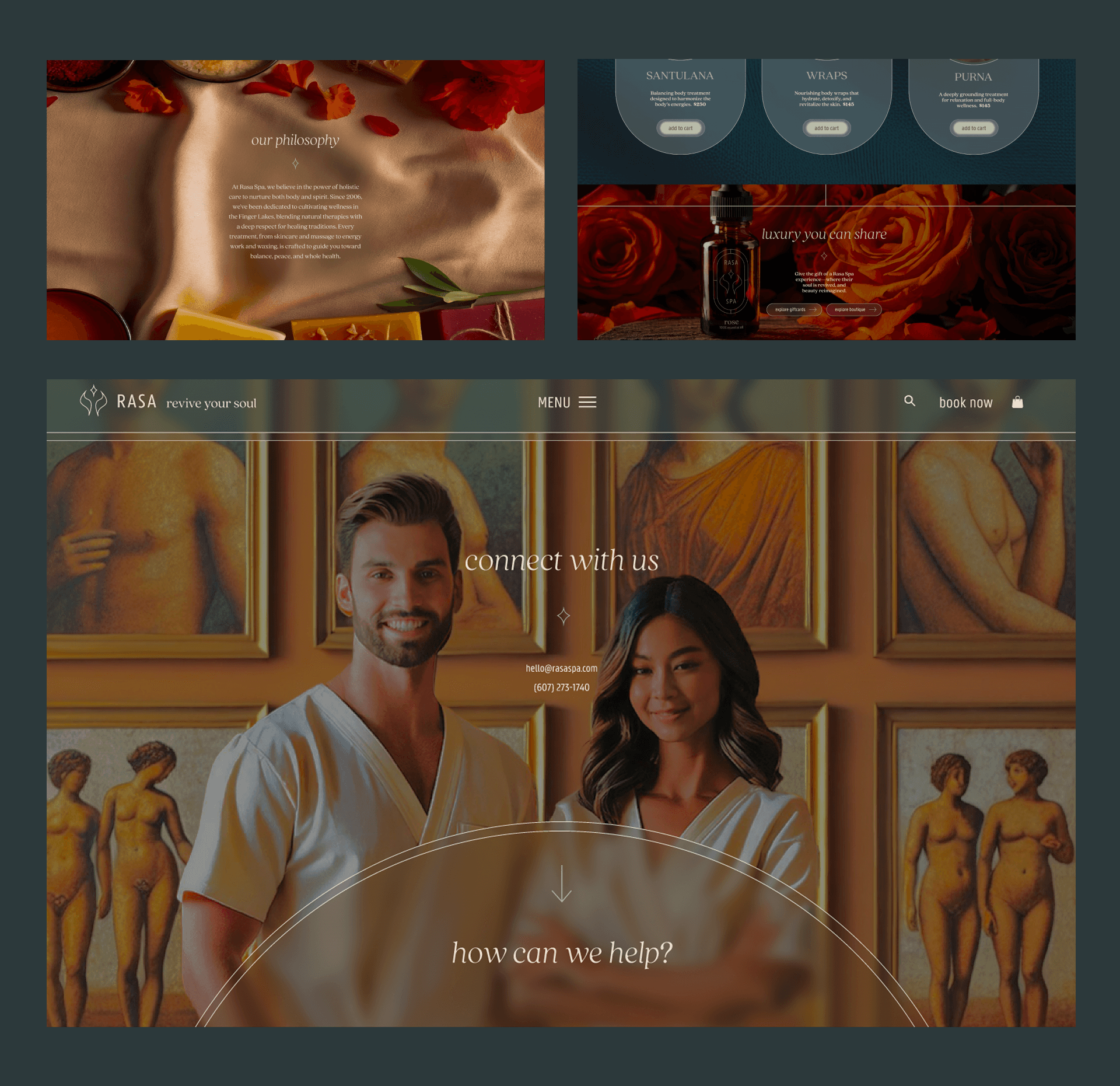 This redesign centers the spa experience around the concept of “rasa,” the emotional essence of classical art. Through a refined logo, moody color palette, modernized imagery, and glassmorphism, the new website creates a more cohesive, intuitive, and immersive digital presence.